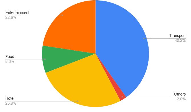 Surprisingly (or not surprisingly), food was our fourth and last category, making up 8% of our total budget. Our food expenses averaged around SG$217.80 per person.